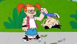 She looks the same as her male counterpart, (Bumper) except she has lipstick and two pony tails. Bumper's trademark reds are replaced by pinks in the outfit. She only appears in the episode, "Johnny Alternative".